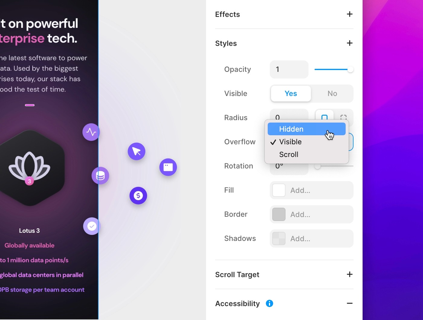 Sticky will only work if all parent layers have overflow set to visible, which may cause issues on mobile. Specifically, an overflowing element in the web page (like the one pictured below) can cause the site to be scrollable horizontally on a mobile device, leading to unwanted results. To prevent this from happening, make sure to double check for overflowing elements in your page and, if necessary, wrap them in a parent layer and set its overflow property to hidden.