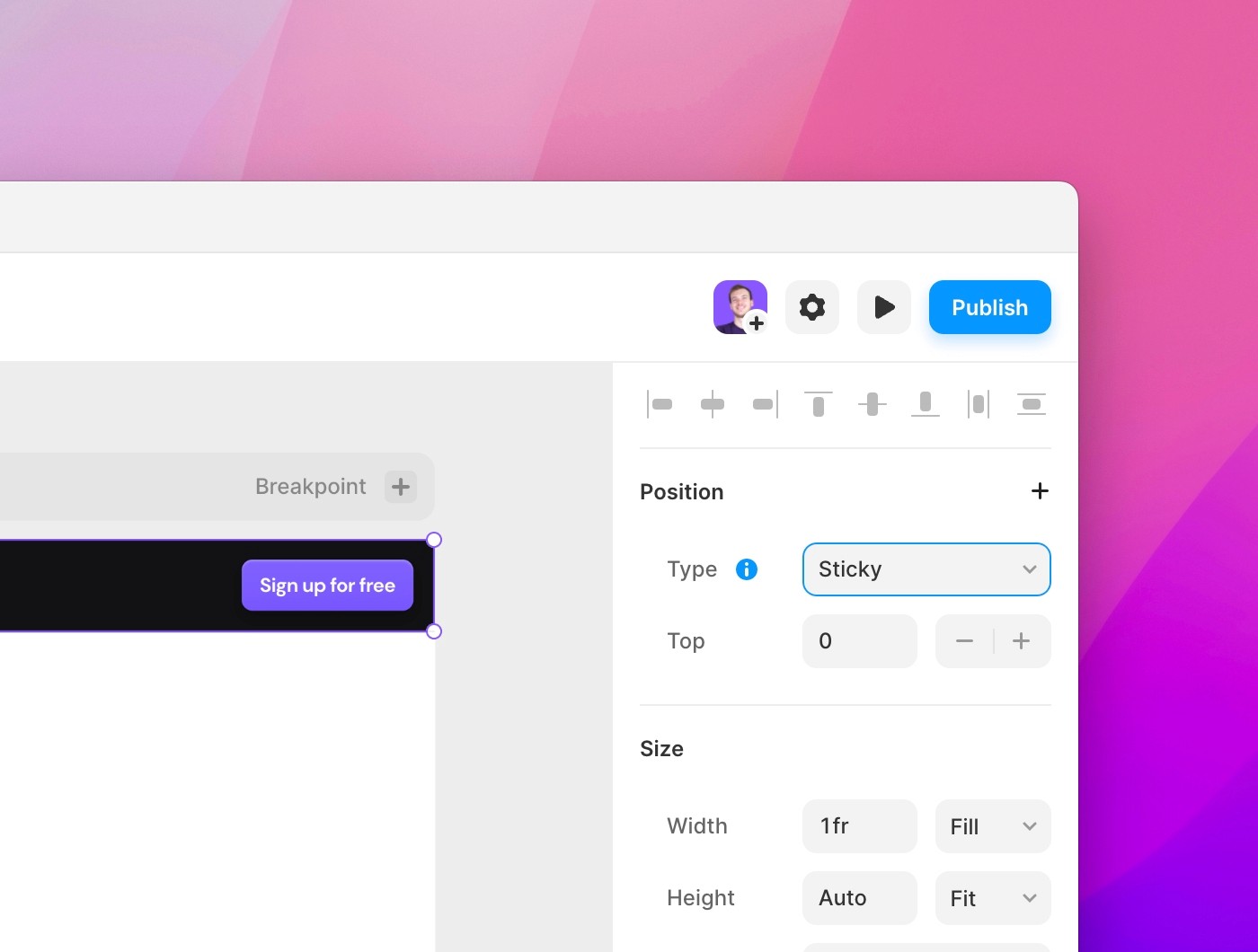 To make a sticky header, select it and head over the properties panel where you’ll find the Sticky property. Here you’ll see four position properties to customize its distance from top, bottom, left, and right. These properties represent the position of the sticky element relative to its parent layer.
