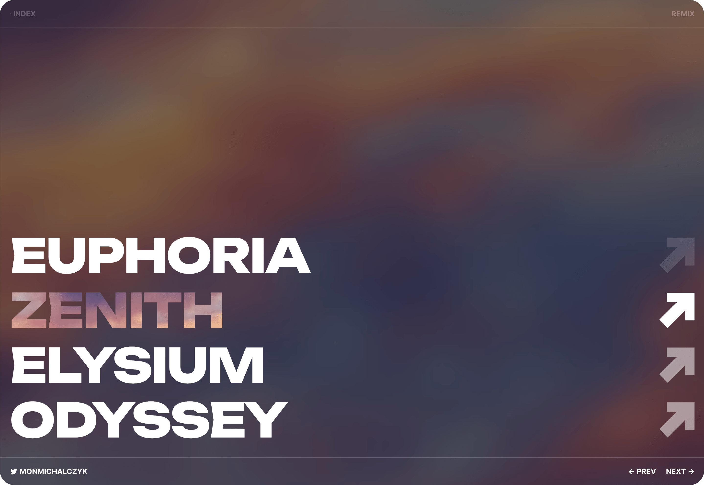 In the last example, once you hover over the list item, a blurred image will fill the size of the page, and the text uses the mask of the picture. You can achieve it by creating a large, blurred image that is hidden in the primary state and then set to visible in a hover state. It’s important to be mindful of the size of your blurred image, as it may affect the performance of your page. With the Text Mask component from https://framer.supply/, you can easily add a mask to your text and adjust the Y offset of the image within the text mask to get the perfect look.