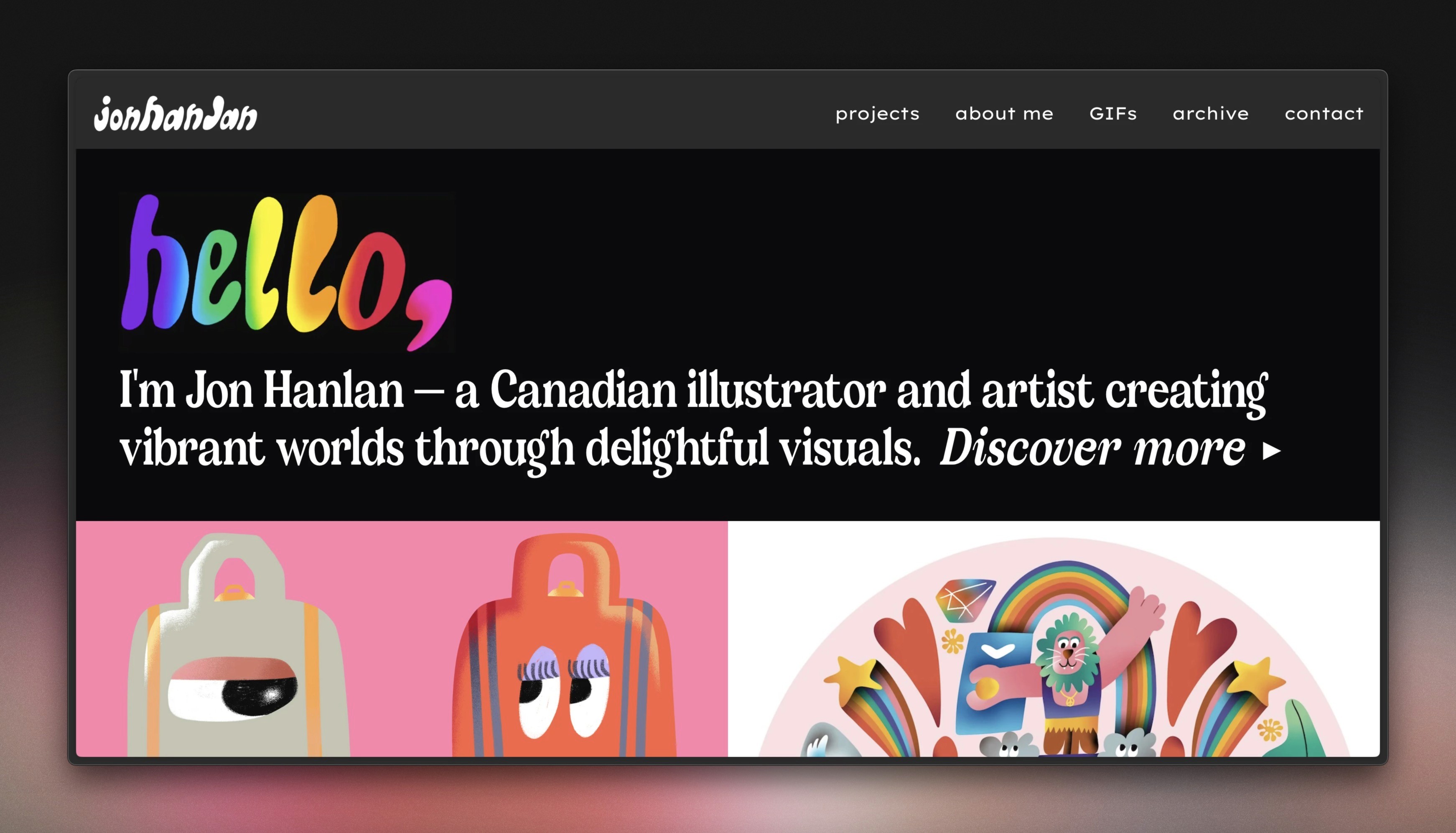Jon Hanlan’s personal site is a lively and engaging showcase of his talent as an illustrator and artist. The use of vibrant colors throughout the website immediately captures attention and displays his artistic energy. His portfolio is formatted in a unique grid format, allowing visitors to easily explore his diverse work. This layout, combined with eye-catching visuals, brings Jon's imaginative worlds to life, making his website a delightful and inspiring experience.