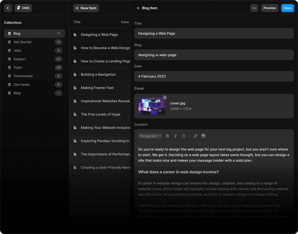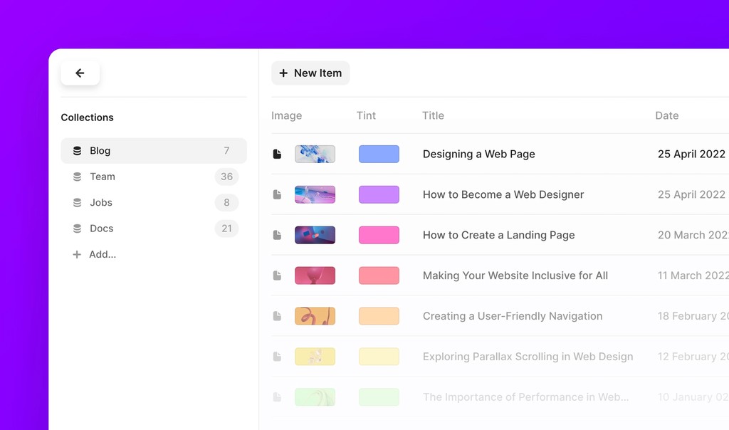 Collections allow you to manage and display content on your website easily. A Collection in Framer functions like a simple database, where you use a set of different fields, each with a specific type, to collect a list of items that can be stored and referenced throughout the website. This allows for greater flexibility and control over the website’s content, making it easy to keep up-to-date with fresh and relevant information without touching your site’s design.