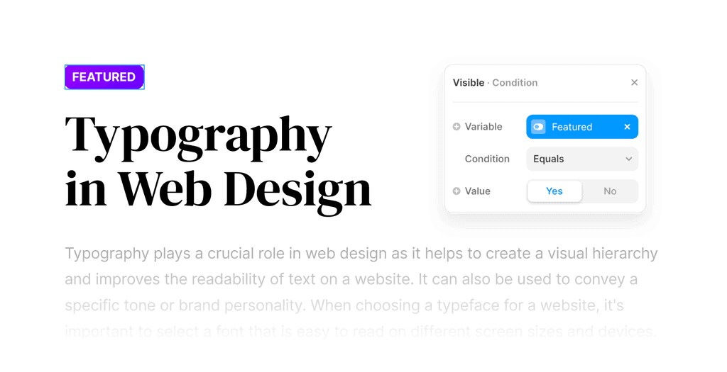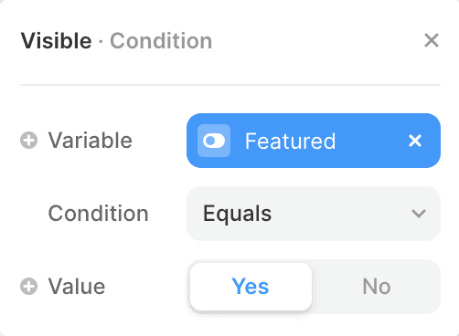 Use conditional visibility to show or hide elements in your collection dynamically. Conditionals allow you to control the visibility of specific details in your design based on certain conditions or criteria, such as only showing a featured badge when a CMS item is set to featured.