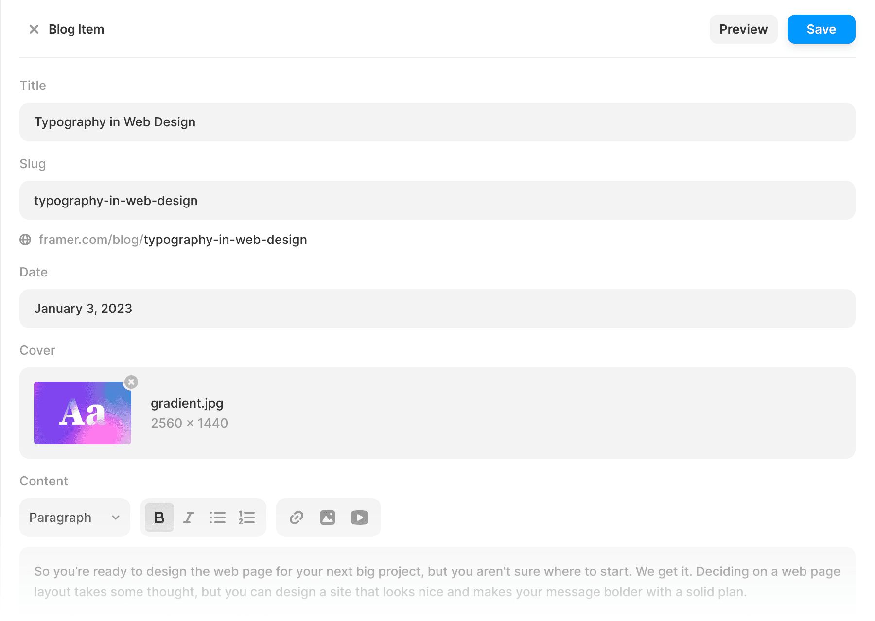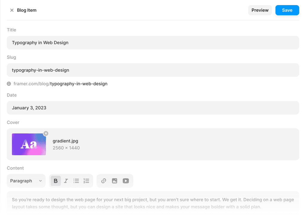Set up different types of input fields depending on the content you CMS item needs. Use text fields to display strings, date fields to show formatted dates, and rich text fields to style your blog posts. Almost every styling option can be turned into a CMS field.