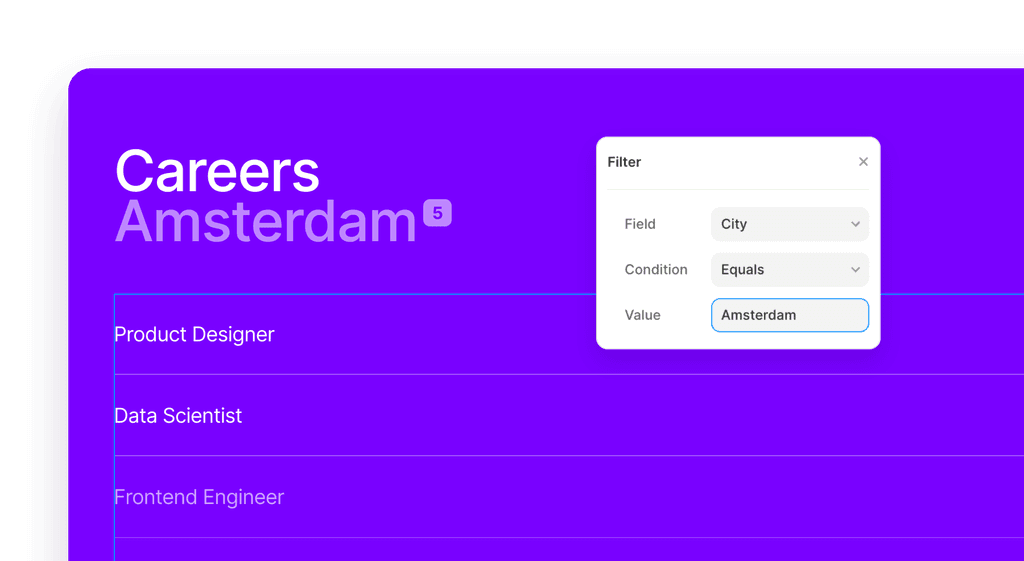 Sort and filter content within a CMS collection. Easily access and manipulate specific data items in a Collection based on criteria such as date, author, or category. Filters make it easy to display the content you need for specific sections of your site.