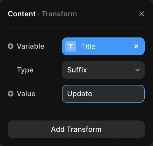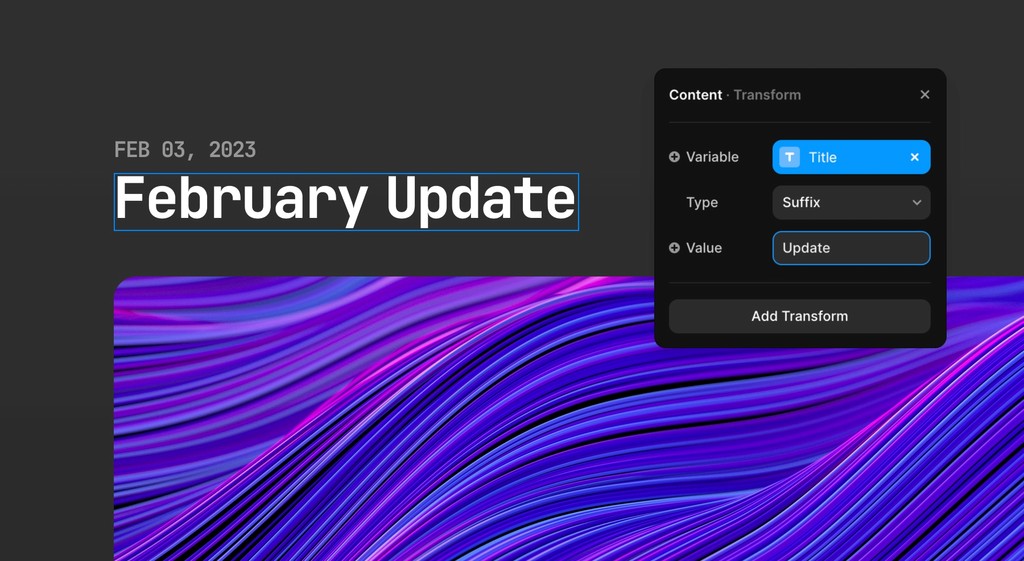 CMS Transforms allow you to add prefixes and suffixes to your text variables. This feature can be helpful when you need to make global changes to the text in your designs, such as adding units of measurement or currency symbols. With Transforms, you can easily apply these changes across your design, saving you time and effort in updating your text manually.