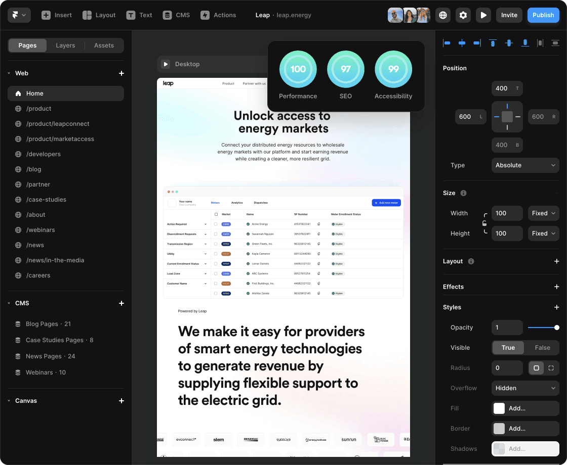 Sites that rank on search engines are fast, have well-structured content, and are accessible to everyone. Framer uses powerful technologies and all the tricks in the book to make your site perform by default.