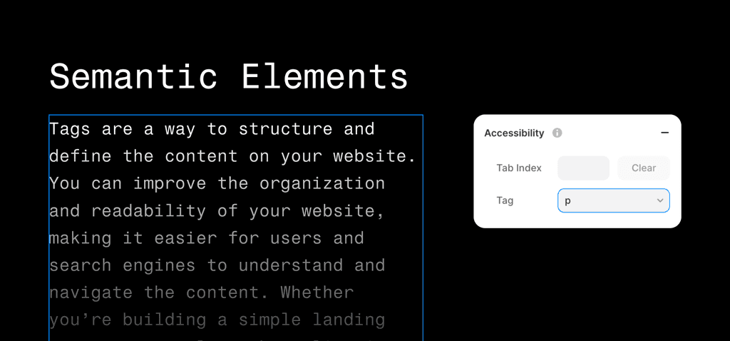 While Framer can do some small things automatically, it comes down to the meaning you add to the elements on your site. Framer gives you excellent tools to improve accessibility, such as Semantic and Frame Tags, Image ALT text, Tab order, ARIA label, or Reduced Motion option.