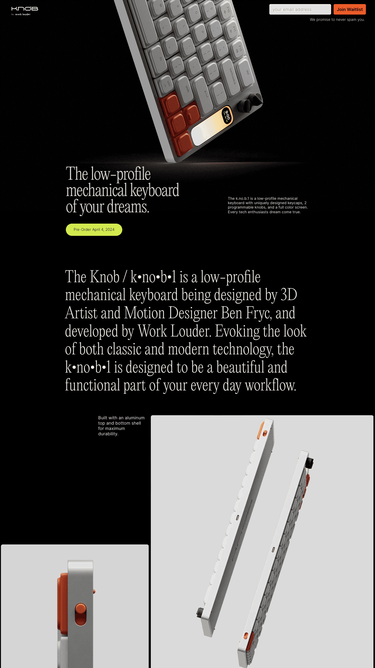 The Knob / k•no•b•1 is a low-profile mechanical keyboard being designed and developed by 3D Artist and Motion Designer Ben Fryc. Evoking the look of both classic and modern technology, the k•no•b•1 is designed to be a beautiful and functional part of your every day workflow.