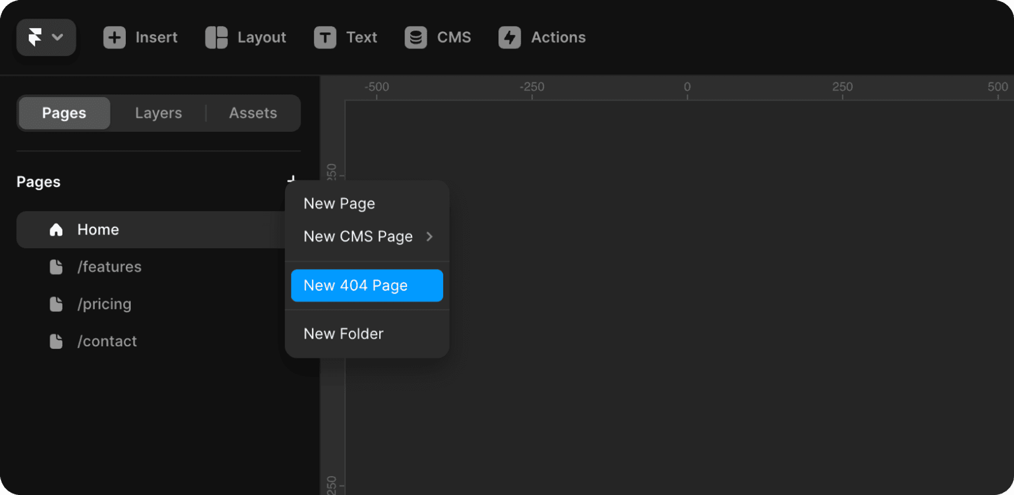 To easily add a 404 page to your project, navigate to the Pages panel in the left sidebar of your project interface. Click the "+" icon and select "New 404 Page" from the drop-down menu. This action automatically generates a new 404 page within your project.