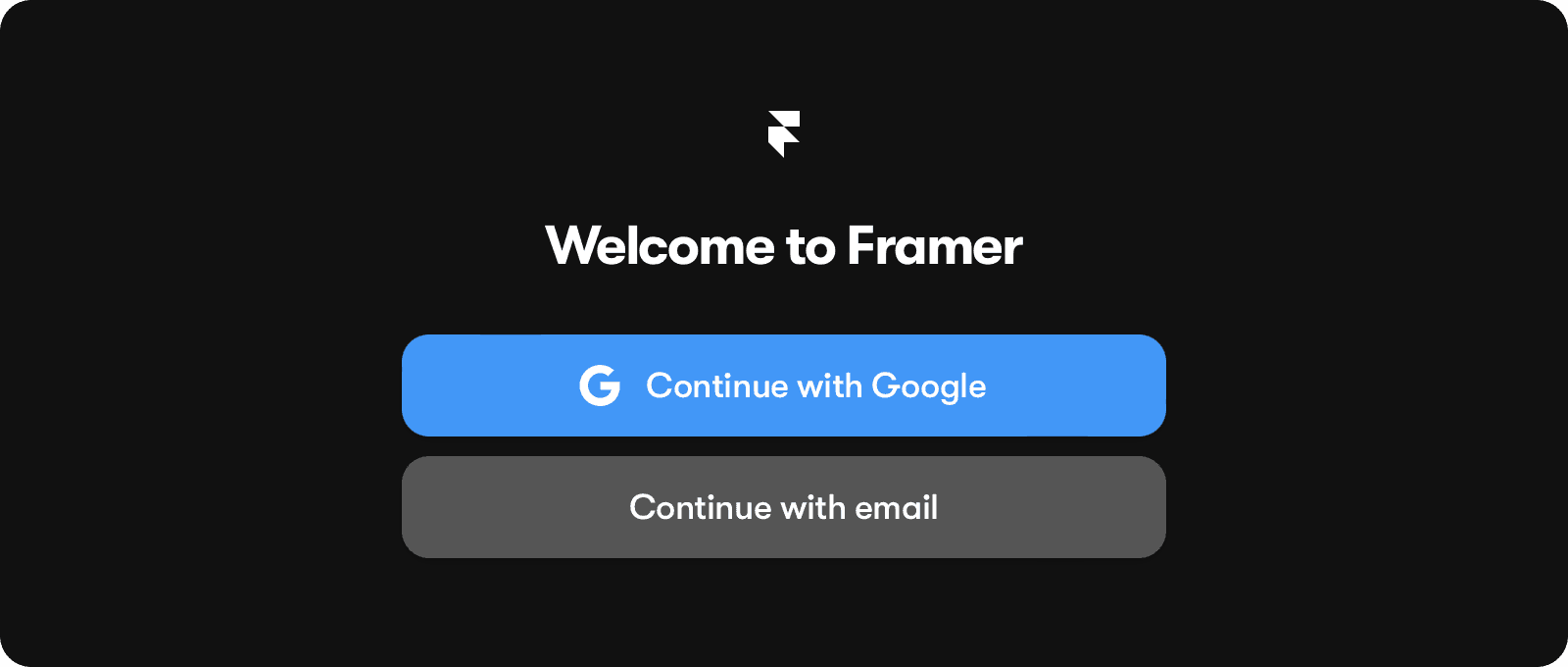 There are different ways to set up a Framer account. You can sign up and start using Framer for free by continuing with your email address or Google account. If you already have an account, we will log you in automatically.