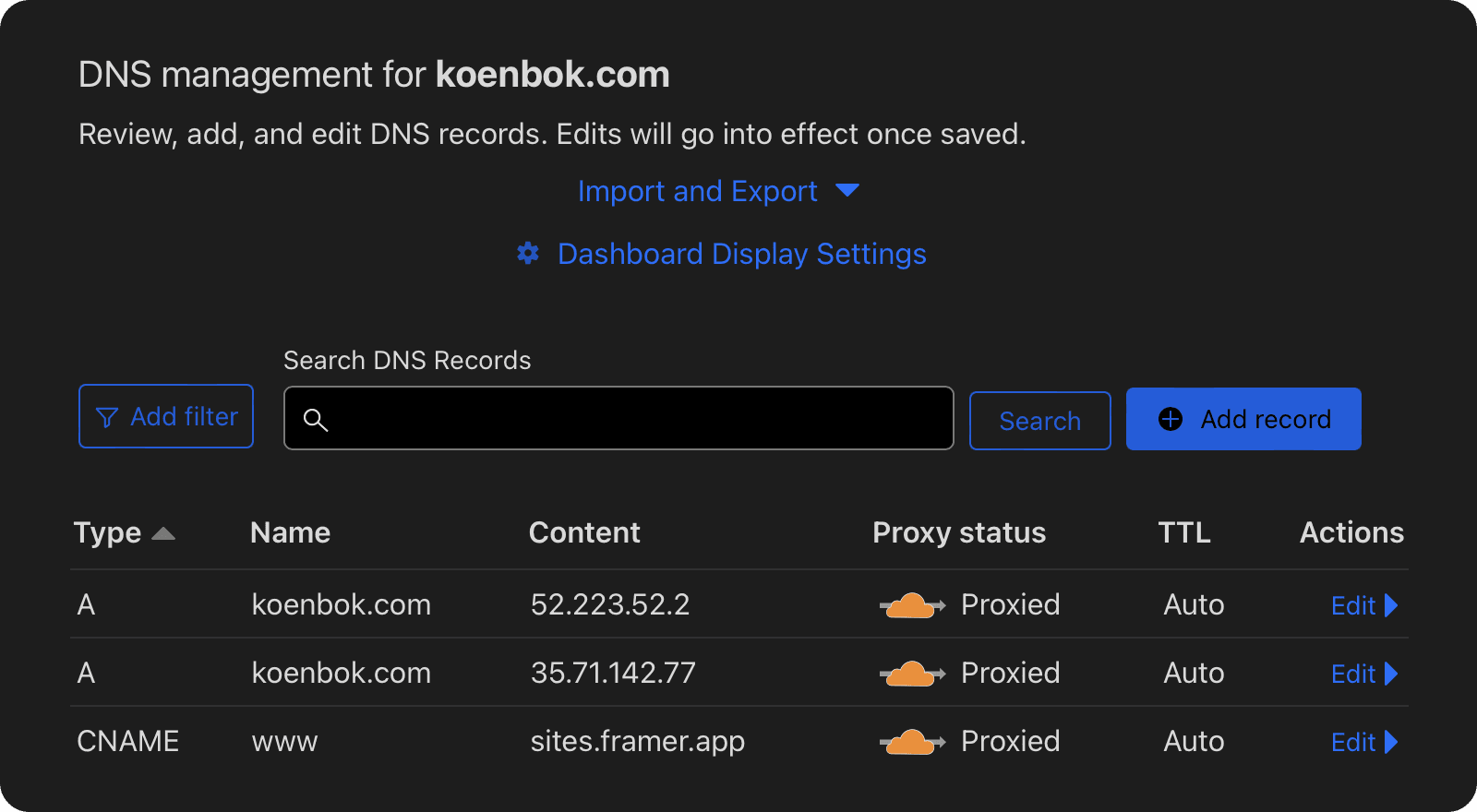 When switching to DNS proxying, Framer will show in the UI that your custom domain connection cannot be verified, because it’s no longer pointing directly at the Framer IPs and hostname. We plan to improve this, but for now this can be ignored.