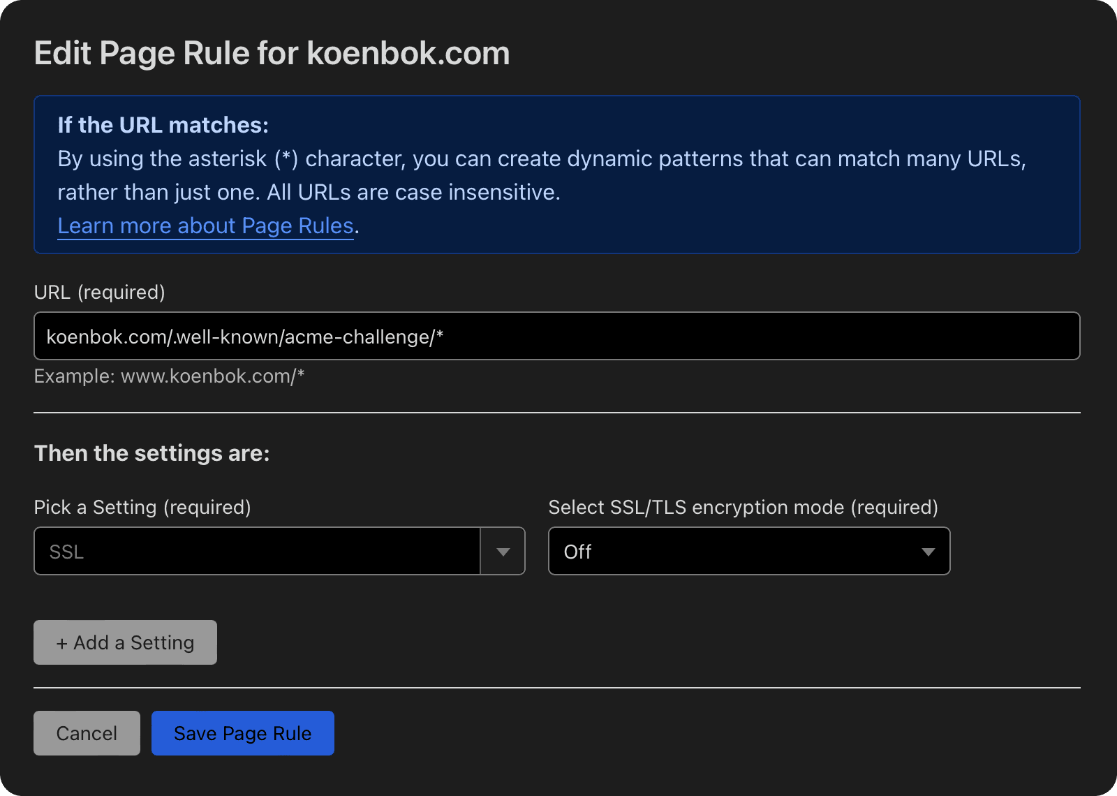 To do this, go to Rules → Page Rules and create a rule for <domain>/.well-known/acme-challenge/* (where the domain is koenbok.com in this case) with the following settings: