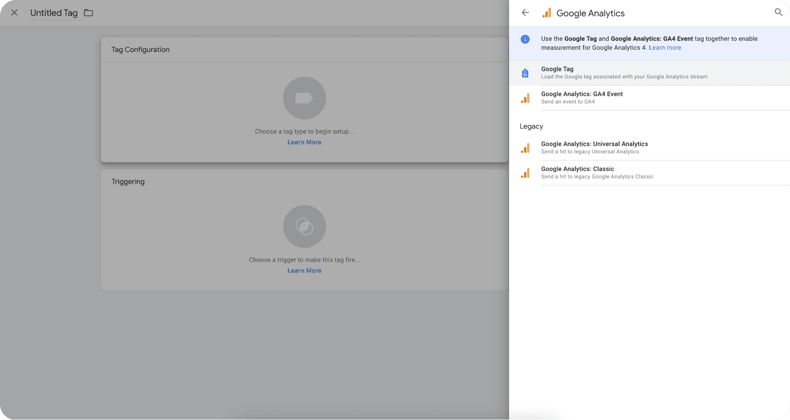 Now go back to Google Tag Manager and click Tags on the left sidebar, click New - Tag Configuration - Google Analytics and choose Google Tag