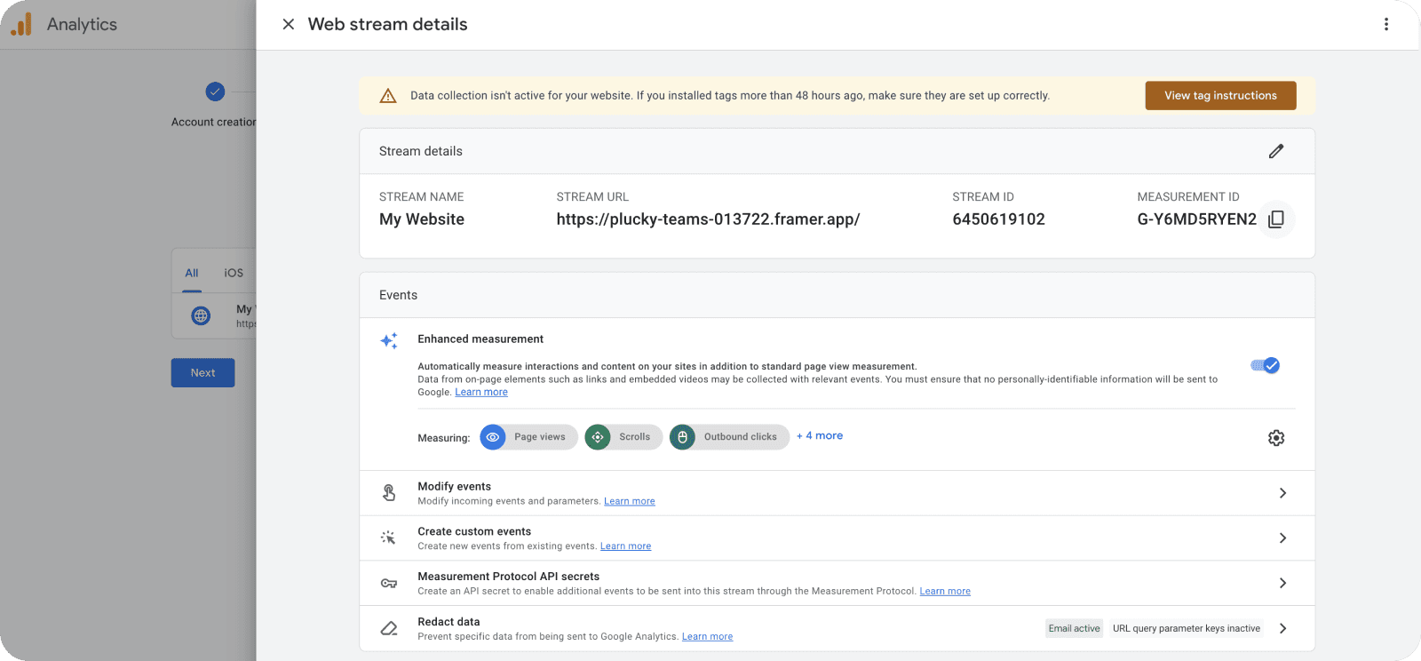 You will then see a page with instructions on how to install the code snippet into your website. Close this page using the X on the top left. Your Measurement ID will be displayed on the page. Click the icon next to it and copy the Measurement ID.