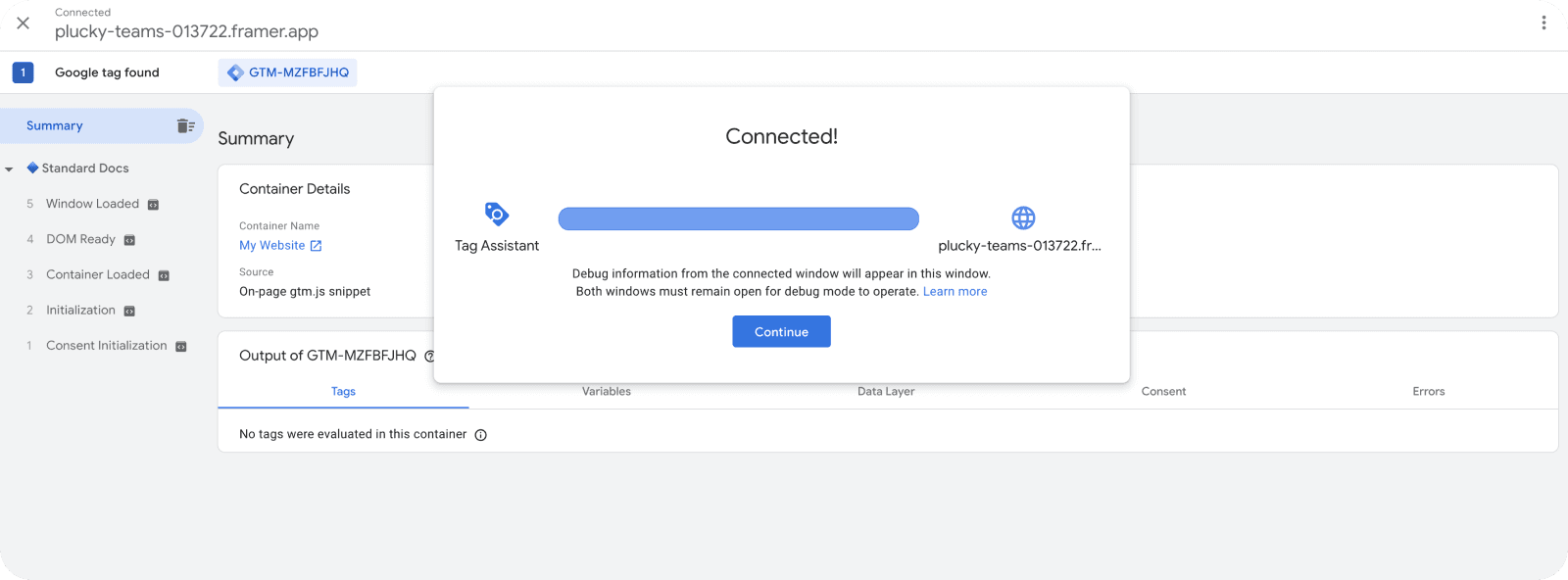 Enter the URL of the website and click on "Connect". When you see Tag Assistant connected, go back to the Tag Assistant tab and click on "Initialization" in the left sidebar. There you will see that it has been successfully fired.
