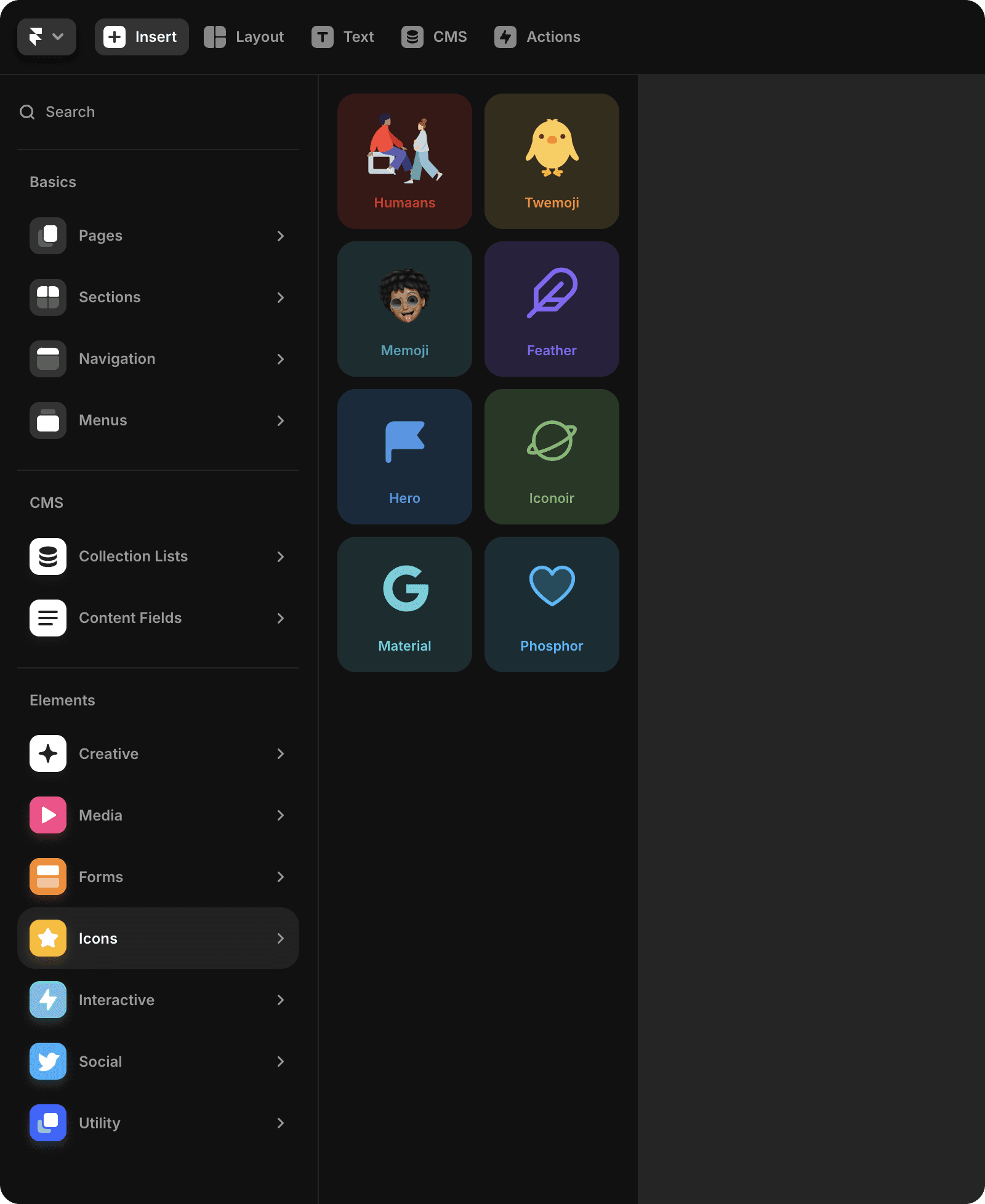 Eframer offers several built-in icon sets, including Phosphor, Feather, Hero, Iconoir, and Twemoji, which can be customized to suit your needs. To add icons to your website, navigate to the Insert menu, select the Icons category, choose your desired icon set, and drag it onto your webpage.
