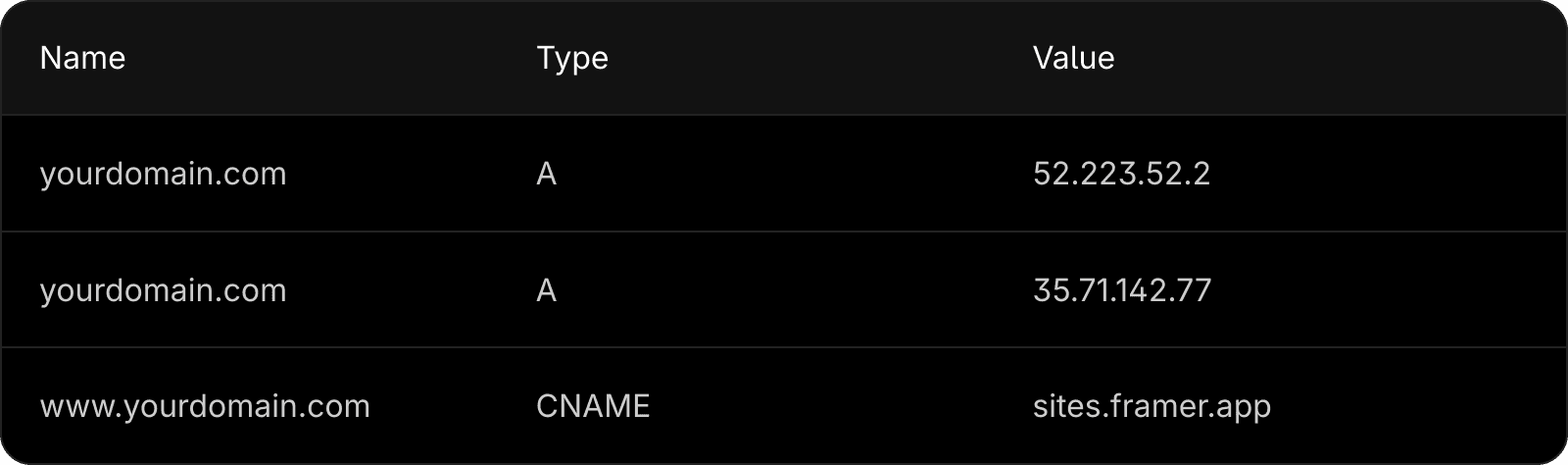 After inputing your domain, replace your DNS records with the Framer DNS records provided below in the web hosting service you have purchased your domain from. Domain registrars and hosting companies typically have their own custom panel for DNS management, but this can typically be done under Domain Settings > DNS Records. Listed below is a list of support articles for the most commonly used domain registrars: