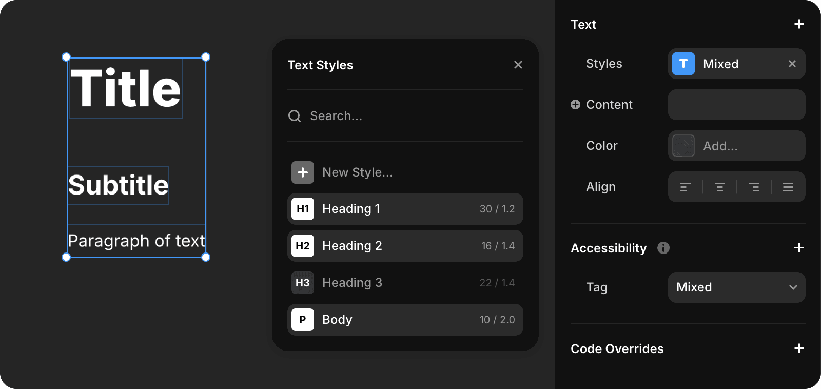 Styles for text elements from the CMS work similarly to the workflow above. The property panel displays all the available styles for your text element.