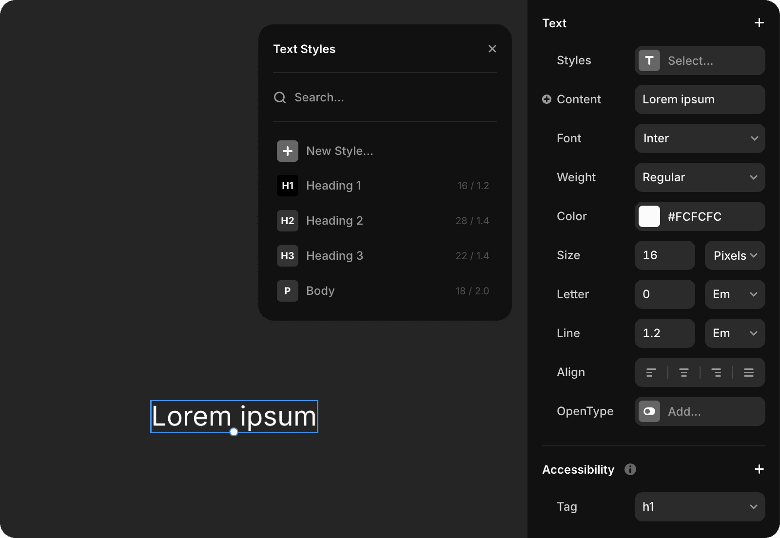 By default, all text is unstyled. To apply a style, select a text element or specific text and click Text → Styles in the properties panel. You can remove styling by clicking the × in the property panel.