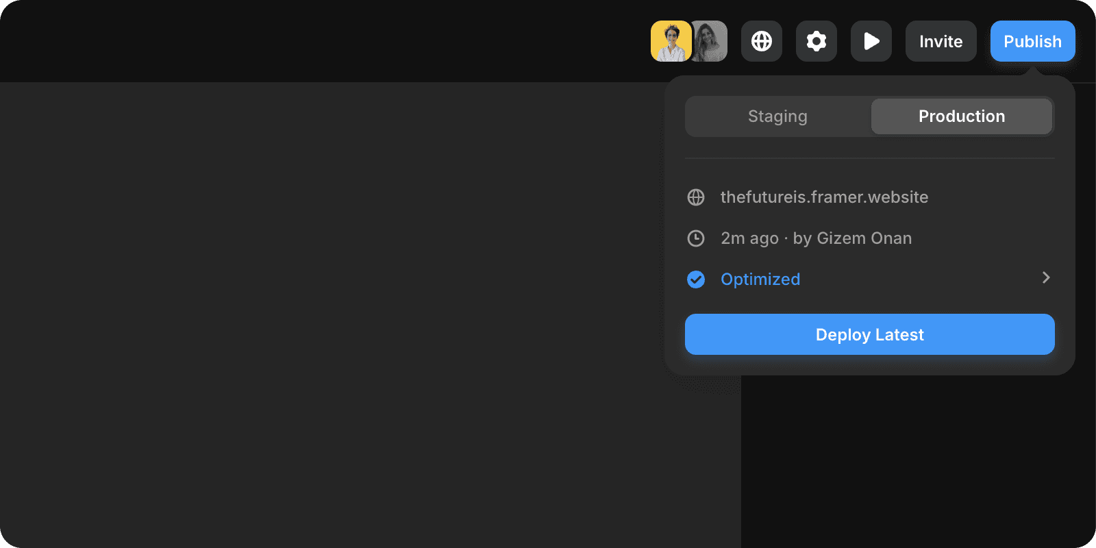 Publishing your website with Framer is remarkably straightforward. In fact, it’s as easy as clicking the "Publish" button located in the top right corner of the Framer editor.