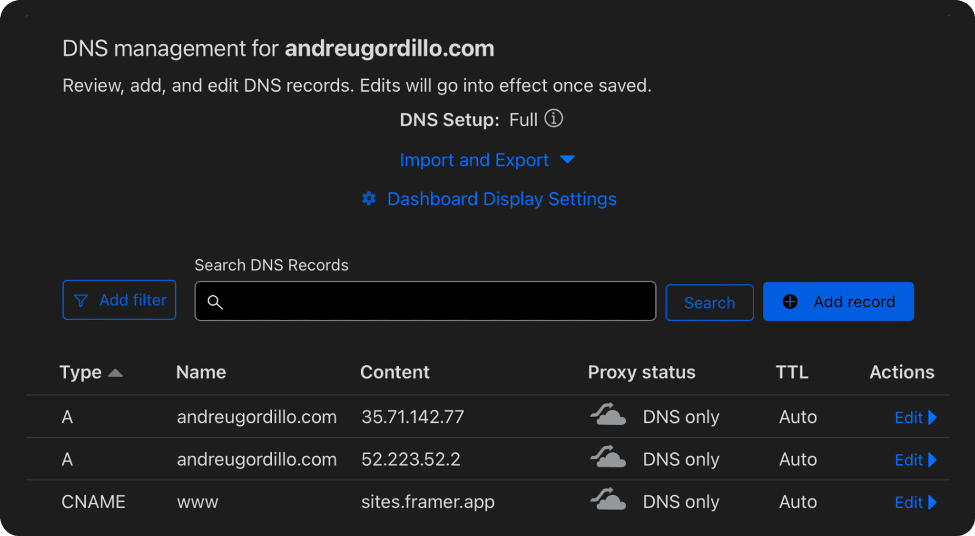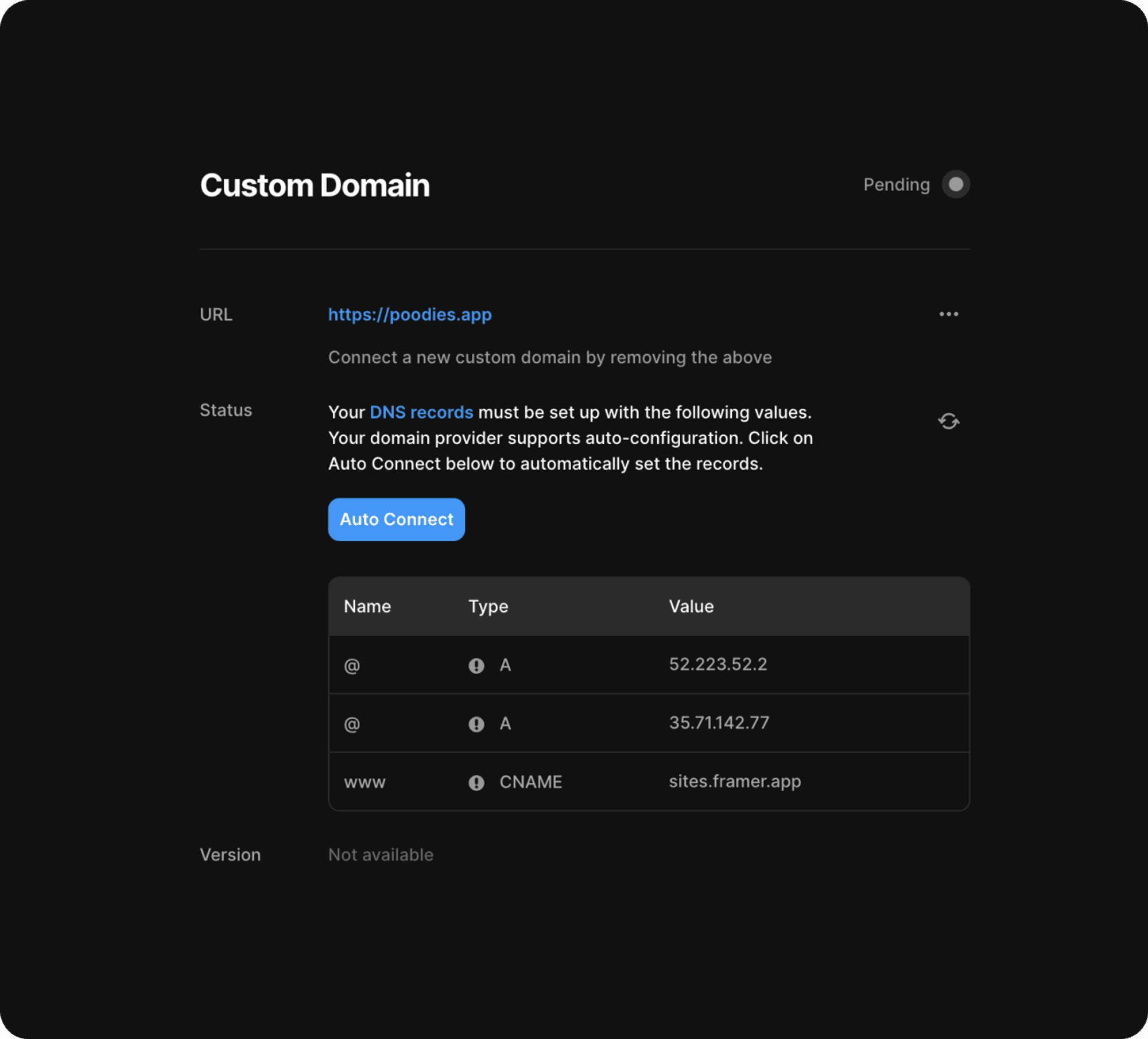 In Framer, custom domains are set up through DNS records. These entries in your domain's DNS map your domain name to specific IP addresses and services, facilitating the connection between users and your project without the need for IP addresses.